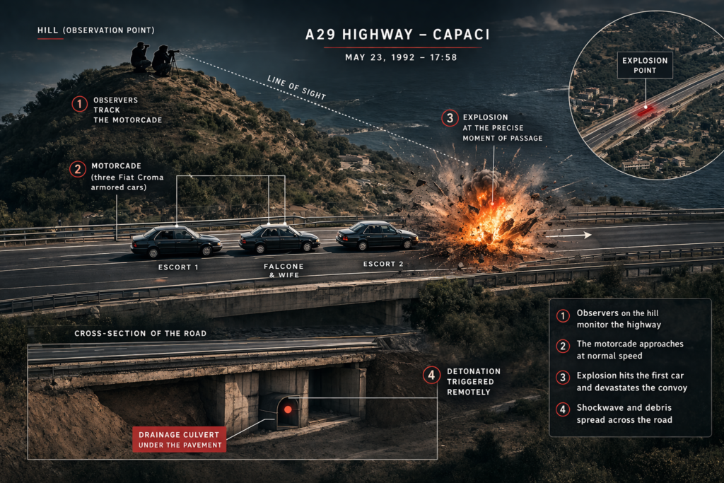 On May 23, 1992, at 5:58 PM, a section of the A29 highway near Capaci was ripped apart by a massive explosion just as the convoy escorting judge Giovanni Falcone was returning from Palermo airport. The blast was so powerful that it destroyed a large portion of the road, sending concrete, debris, and vehicles into the air, leaving behind a scene of devastation visible from miles away.